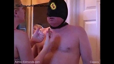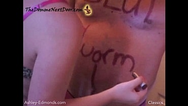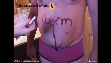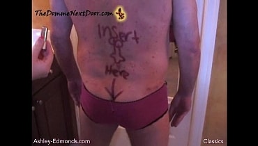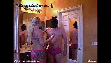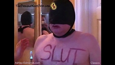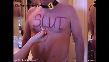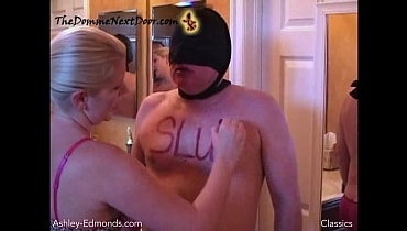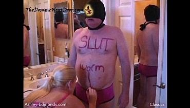 I was feeling a little silly today and since I was already ready for the day with My makeup on bozo needed to be made up too! Of course his Mom's email address came in handy when I thought My handy work was too good not to share. It's so easy to wipe away all dignity with submissive cucks like these. He can't help but cum on a toothbrush even though he knows I'm going to scrub his filthy mouth with it. Ashley Edmonds is wearing a pink and leopard print bra and panty set. Her submissive is also in pink panties. She puts black pantyhose over his face and mocks him as she writes on his body with red lipstick.